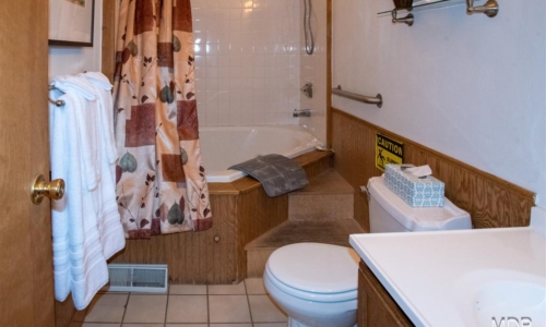 This main floor 1-bedroom has a queen size bed and skylight, living room, full bath with a double whirlpool tub, kitchen, and fireplace. Additionally you have access to large outside sundeck. Rates: $119 – $199 ($40 cleaning fee included in rate).