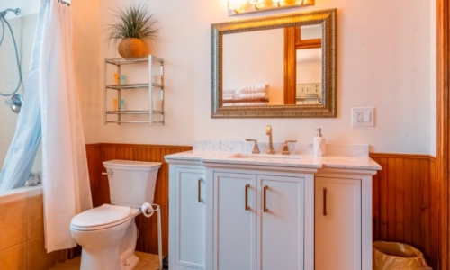 This large second floor 2-bedroom has queen size beds, full kitchen, dining room, large living room with fireplace and a private bath with a double whirlpool tub. Additionally you can directly access a large sundeck out back, part of which is covered. Rates: $199 – $300 ($40 cleaning fee included in rate).